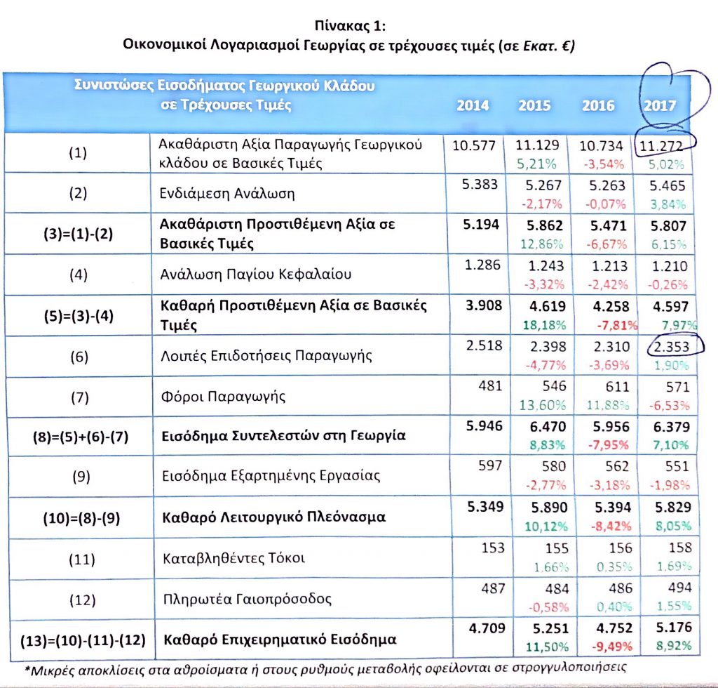 Ανατρέχοντας στα στοιχεία της ΕΛΣΤΑΤ, διαπιστώνουμε ότι για το 2017 η ακαθάριστη αξία παραγωγής του γεωργικού κλάδου σε βασικές τιμές ήταν 11.272 εκ.ευρώ και οι επιδοτήσεις παραγωγής ήταν 2.353 εκ.ευρώ.