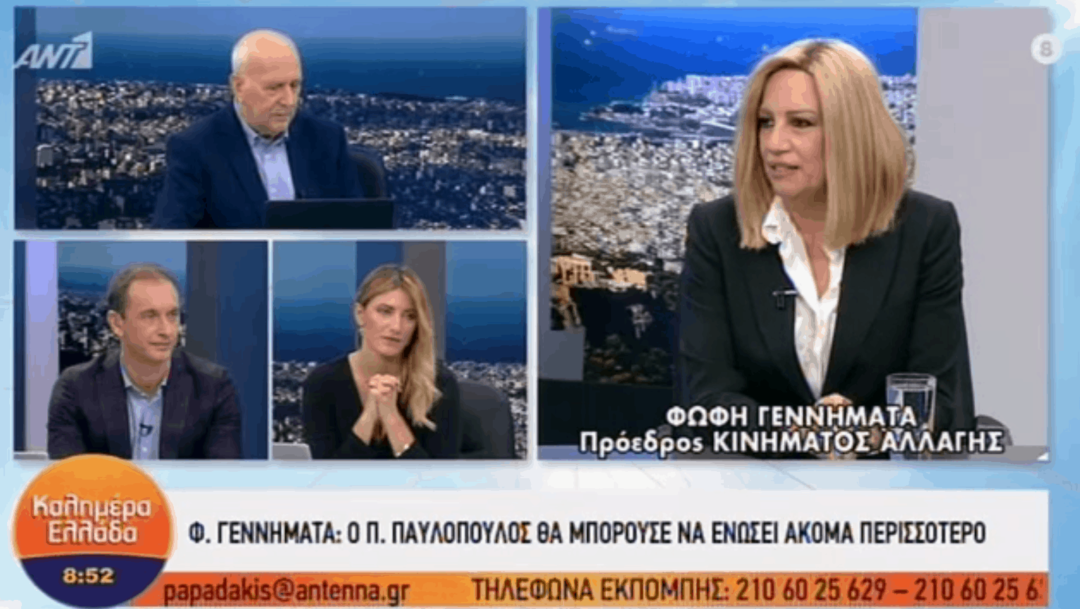 Συνέντευξη Φώφης Γεννηματά, Προέδρου του Κινήματος Αλλαγής, στον τηλεοπτικό σταθμό ΑΝΤ1 και στην εκπομπή «ΚΑΛΗΜΕΡΑ ΕΛΛΑΔΑ» με τον δημοσιογράφο Γιώργο Παπαδάκη