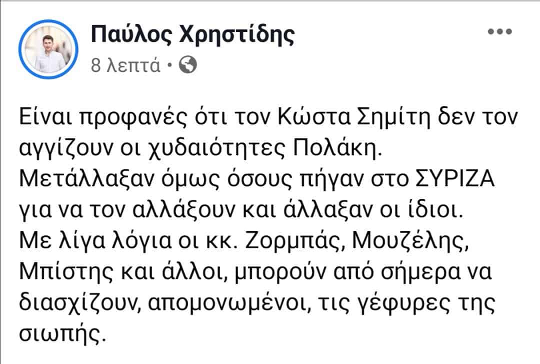Σχόλιο Παύλου Χρηστίδη Εκπροσώπου Τύπου του Κινήματος Αλλαγής με αφορμή τις δηλώσεις Πολάκη για τον κ. Σημίτη (social media)